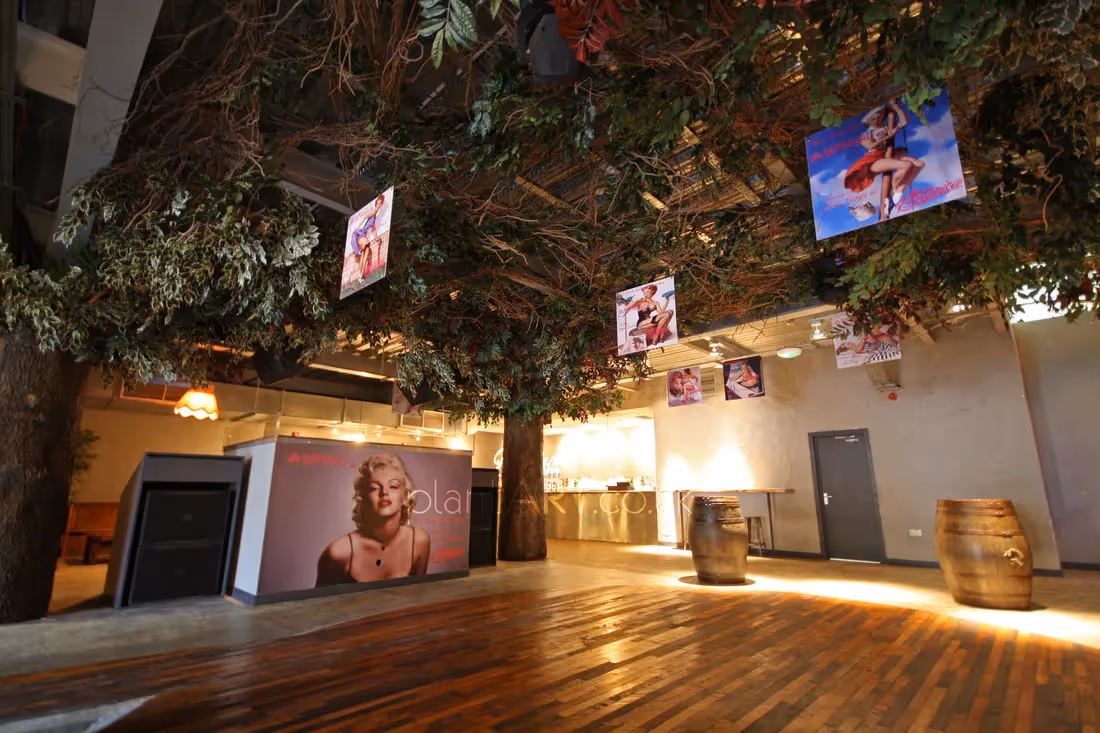 The nightclub’s dance floor features four tall, unsightly RSJ columns. These were en-cased with large fake tree trunks. The canopies of the four large tree trunks were joined together, creating a magical outdoor experience inside, and covering the entire ceiling of the dance floor - one vast profusion of mixed foliage camouflaging the unsightly ceiling.