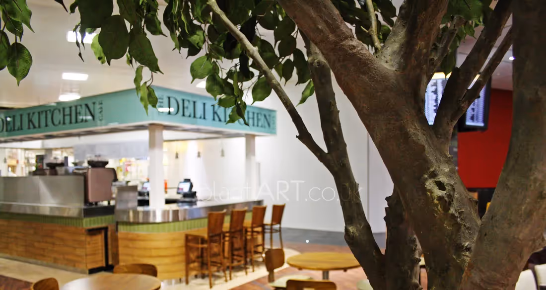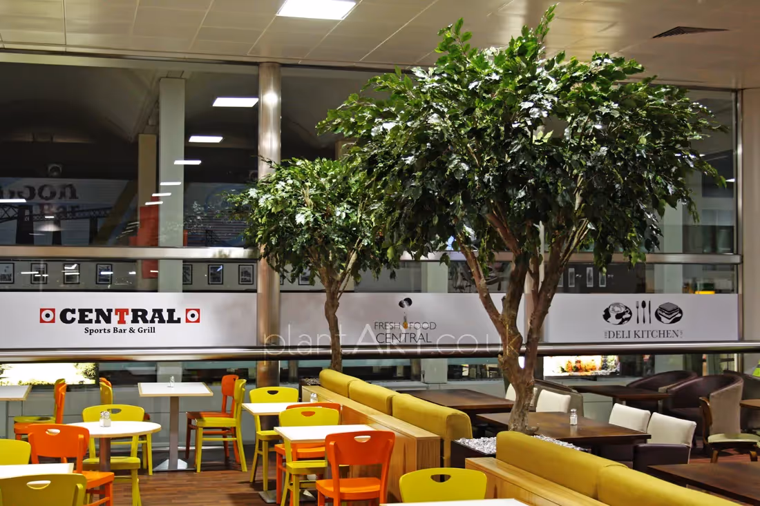 For a restaurant at Glasgow Airport, plantART Bespoke constructed these tall customised artificial ficus trees using synthetic fibreglass trunks, natural branches and artificial ficus foliage to form the canopy of branches. The artificial leaves are inherently flame retardant (IFR), an imperative requirement when installing artificial trees within public spaces.