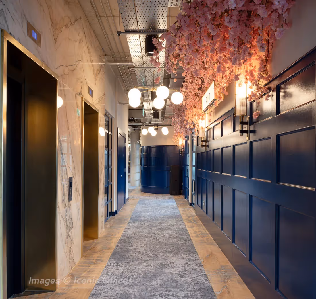 The two extensive canopies that followed along corridors fixed to the underside of the ceilings use a matrix of natural wood branches interlinked, to appear as if growing naturally. Each display originated from a full-height feature trunk with branches fanning out over the adjacent walls. Specially fabricated top and bottom steel brackets and fixings provide a secure and stable fitting.