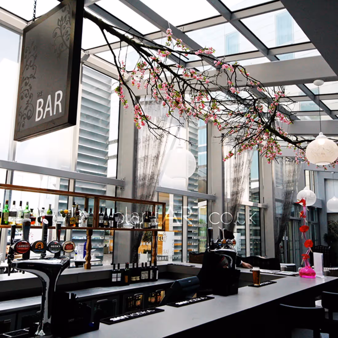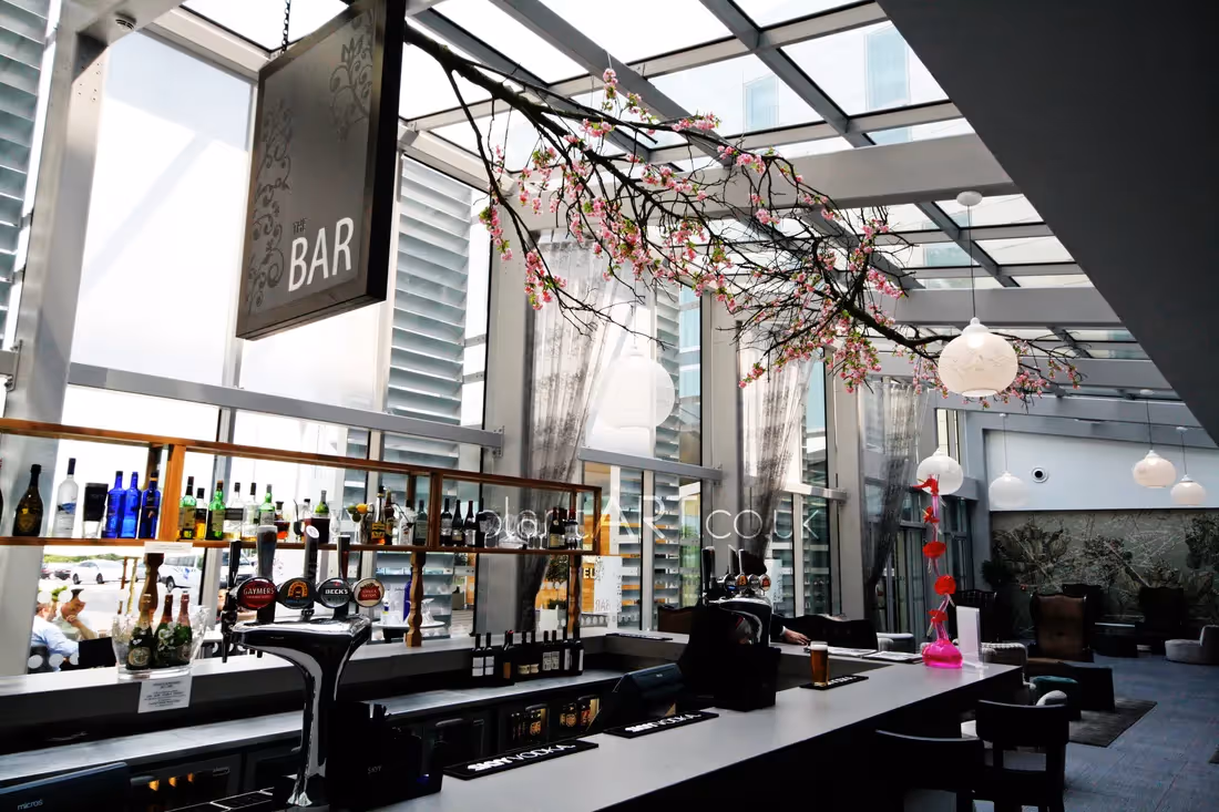 For the reception, foyer and bar area of the Raddison Blu East Midlands International Airport Hotel, plantART Bespoke created two 8m long artificial pale pink cherry blossom trees. Unusually these trees were not installed upright but, instead, they were suspended from the ceiling horizontally with the foot of their trunks joined seemingly seamlessly and their canopies reaching out in both directions.